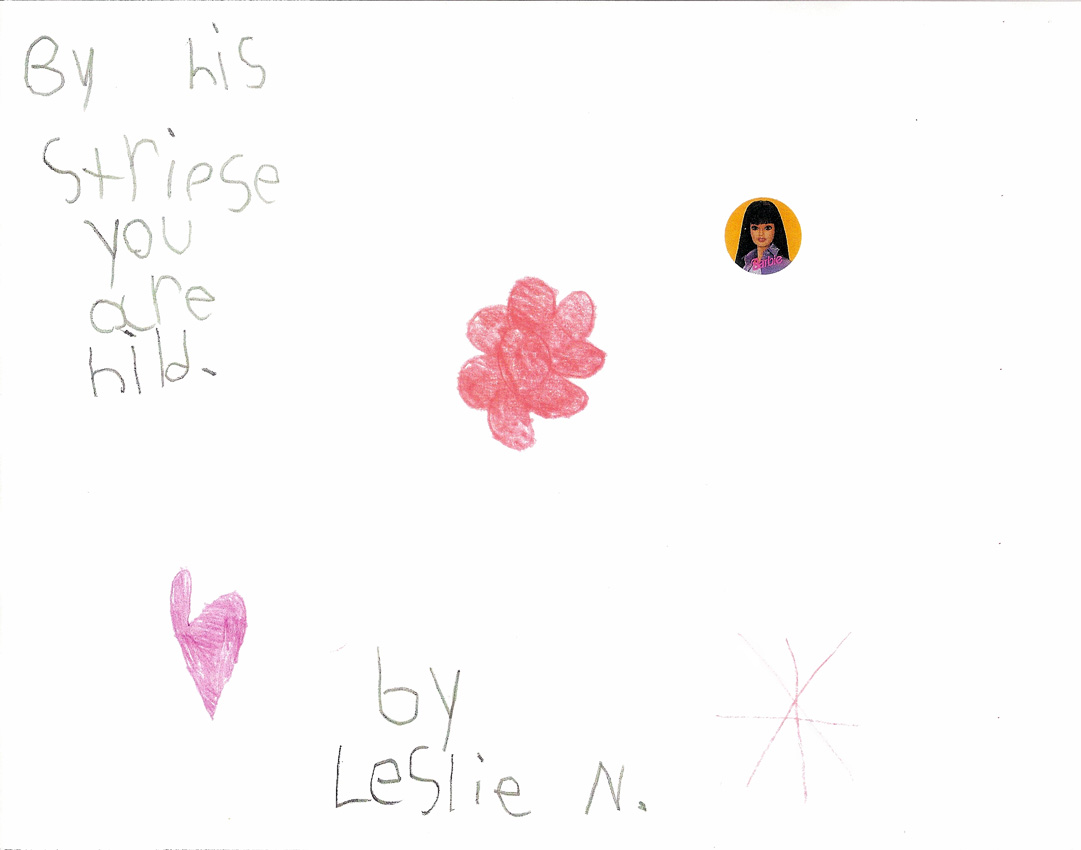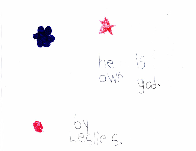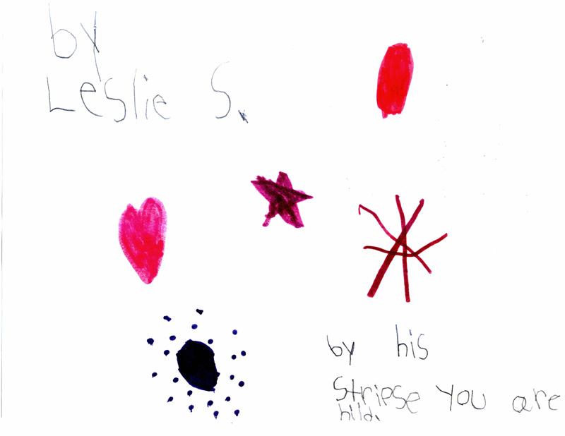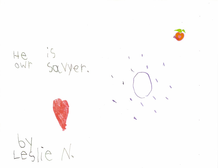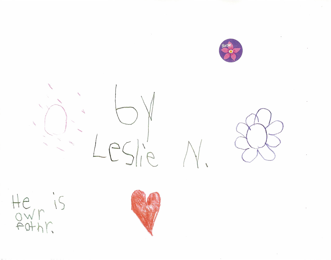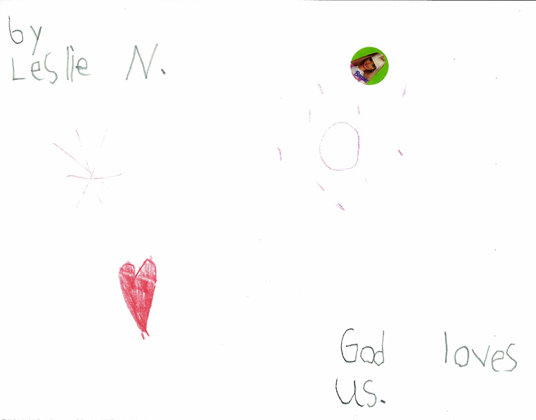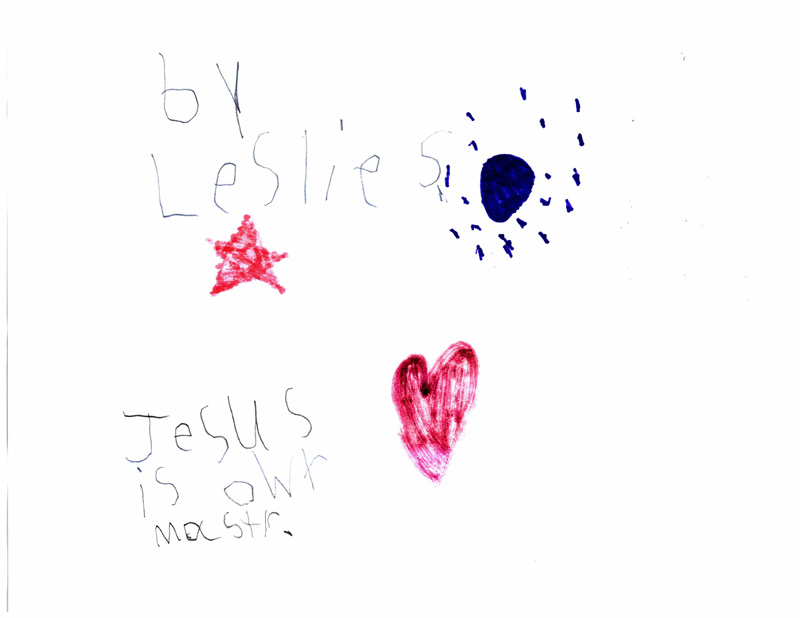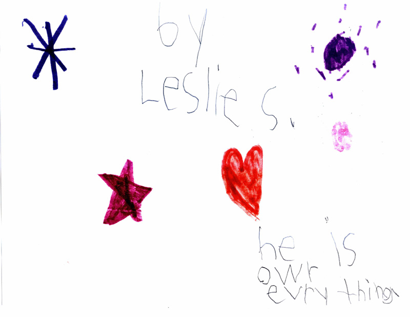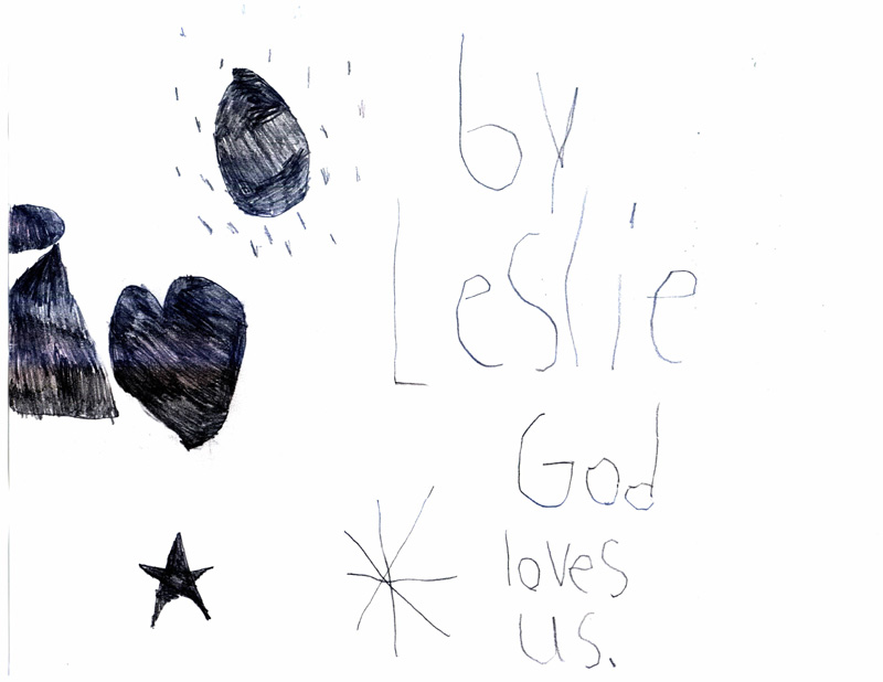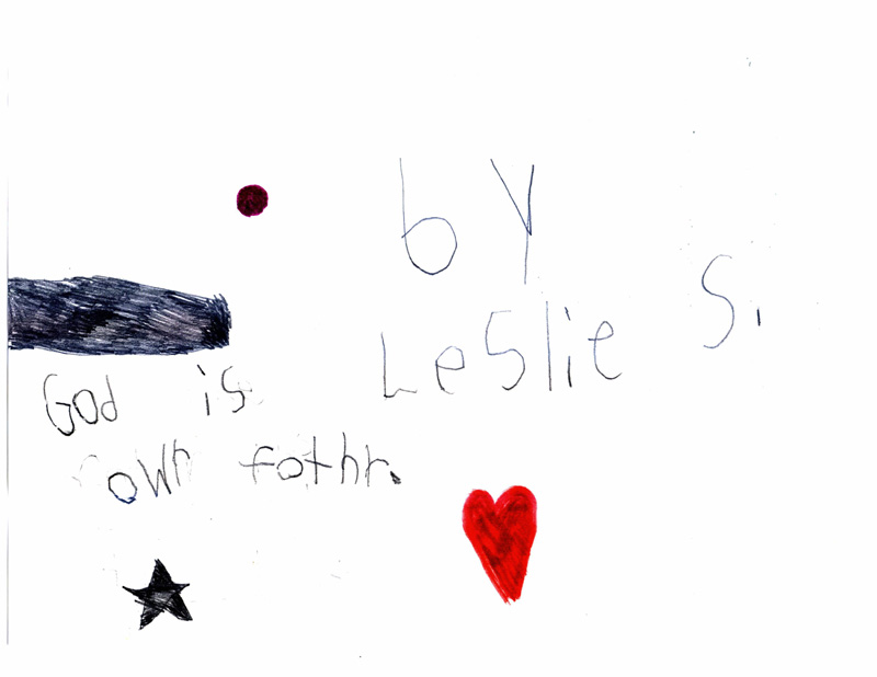 These pictures look like nothing that Leslie had ever drawn before. Her typical drawings had included flowers, trees, pets, houses and people similar to what you would expect from a 7-year old. These are significantly different with the star, heart and circle element surrounded by dots on almost every picture. It is quite evident to us that these powerful messages came to Leslie directly from the Lord.