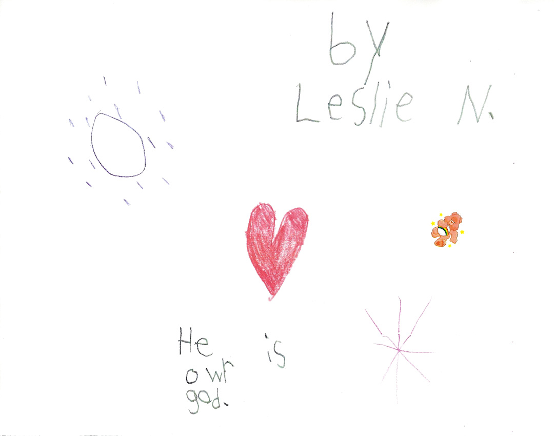 These pictures look like nothing that Leslie had ever drawn before. Her typical drawings had included flowers, trees, pets, houses and people similar to what you would expect from a 7-year old. These are significantly different with the star, heart and circle element surrounded by dots on almost every picture. It is quite evident to us that these powerful messages came to Leslie directly from the Lord.